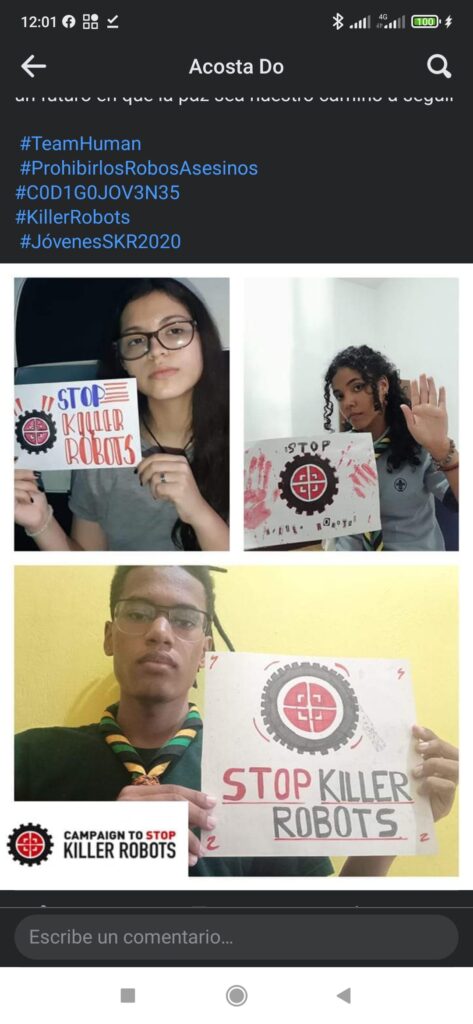 En compañía de los Dirigentes de unidad realizamos una actividad grupal y publicidad por nuestras redes de la iniciativa en contra de las armas autónomas que persiguen acaban con seres humanos,en esta actividad participaron todas las unidades del grupo de manera activa y bastante motivados