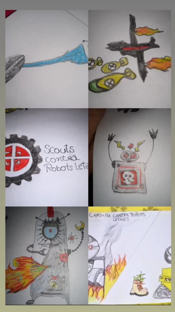 En conjunto se elaboraron 5 dibujos de como se imaginan un robot letal variando desde robots como en las películas, pasando por aviones inteligentes lanzando bombas y ovnis y para lo cual se hizo un collage de las mismas conjunto al logo de la iniciativa #scoutscontrarobotsletales
